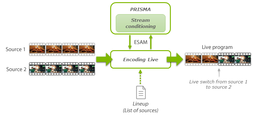 This use case is an example of how to configure Live Encoder and Prisma>Stream Conditioning to switch from one live source to another.