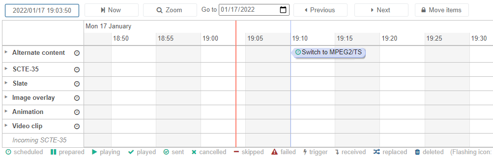 The operation is added to the timeline. At the scheduled time, the channel will switch to lineup_mpeg2ts.