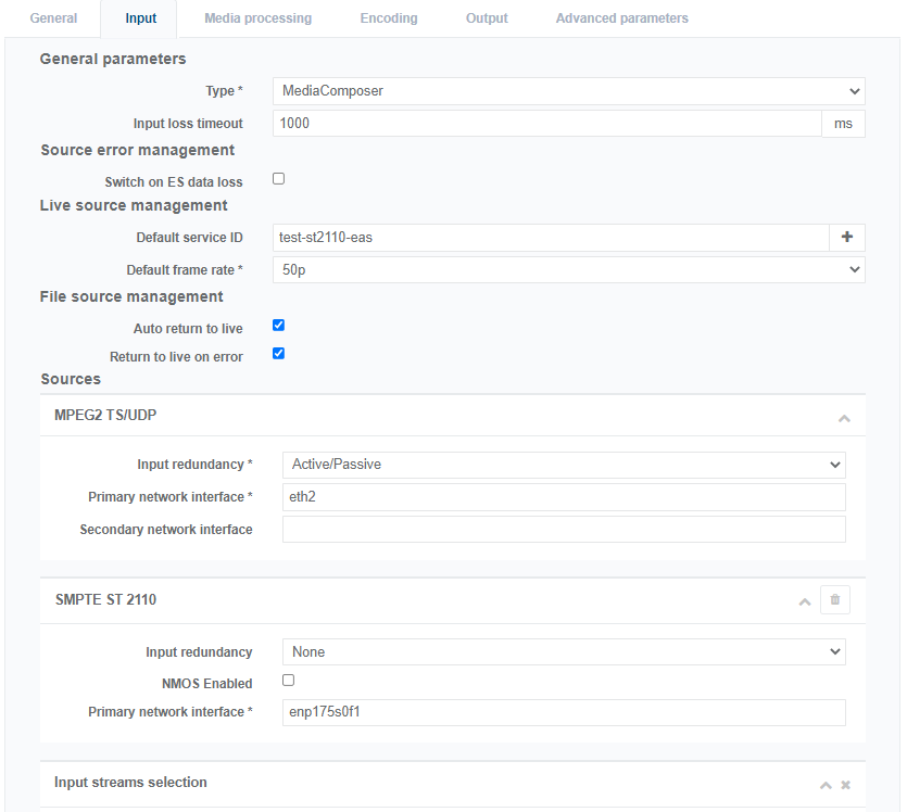 In active/active mode, both sources capture in parallel, provide statistics on transport and demux layers, but only one source is fully decoded at any given time.NMOS Enabled Leave unchecked. Enables NMOS for EL service. Primary network interface enp175s0f1 Name of the input interface used to capture the input stream.