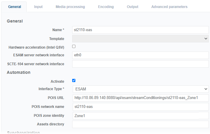 Parameter Value Description Type SCTE-35 OOB Select the type of metadata. Network name st2110-eas Corresponds to the Acquisition Point Identity defined in the ESAM specification. Zone identity Zone1 Corresponds to the Zone Identity defined in the ESAM specification. Recover conditioning state if failover Leave to No Selecting POIS enables to keep the conditioning status after an encoder failover by asking to an external system. It requires entering the POIS URL and network interface name. Automation stream Tick this checkbox. Activates Live Encoder out-of band interface to communicate with Prisma. You should have the following configuration for the out-of-band stream: