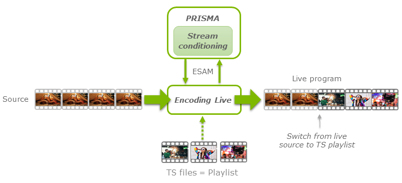 This use case is an example of how to configure Live Encoder and Prisma>Stream Conditioning to switch from a live source to a TS playlist.