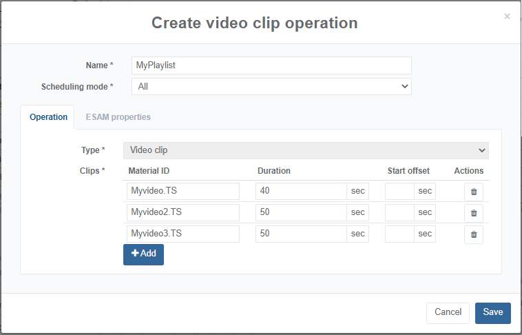 In our example, we will now create an operation with a playlist that includes three video clips.