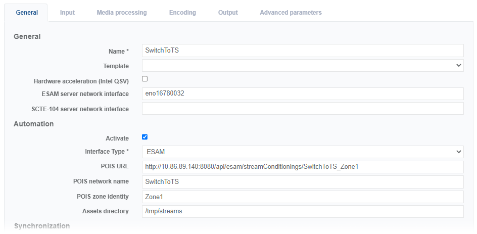 Parameter Value Description Type SCTE-35 OOB Select the type of metadata. Network name SwitchToTS Corresponds to the Acquisition Point Identity defined in the ESAM specification. Zone identity Zone1 Corresponds to the Zone Identity defined in the ESAM specification. Recover conditioning state if failover Leave to No Selecting POIS enables to keep the conditioning status after an encoder failover by asking to an external system. It requires entering the POIS URL and network interface name. Automation stream Tick this checkbox. Activates Live Encoder out-of band interface to communicate with Prisma.