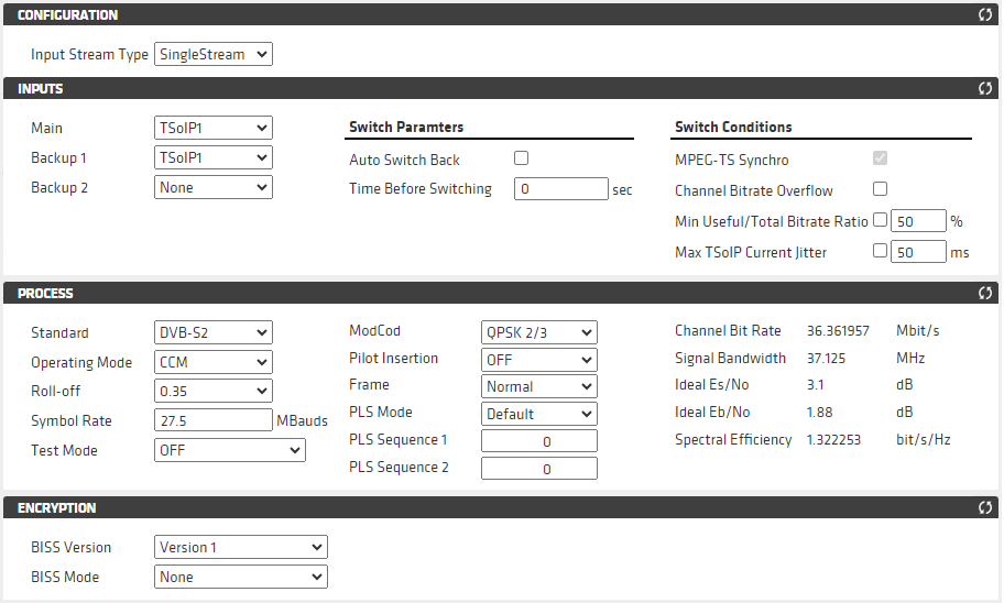 Create a new feed based on the Live Encoder + Multiplexer + Satellite Modulator template.