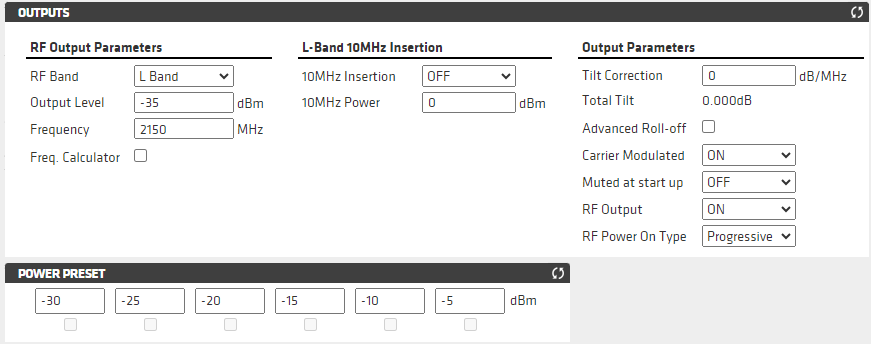 To configure RF output parameters, go to Settings then Outputs: