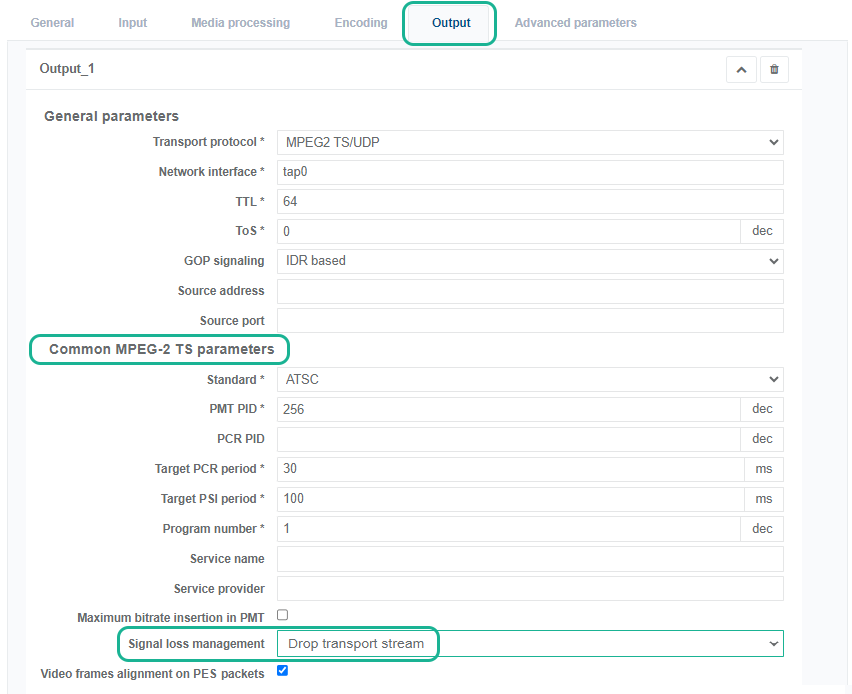 In the Common MPEG-2 TS Parameters section, set the Signal loss management to Drop transport stream.