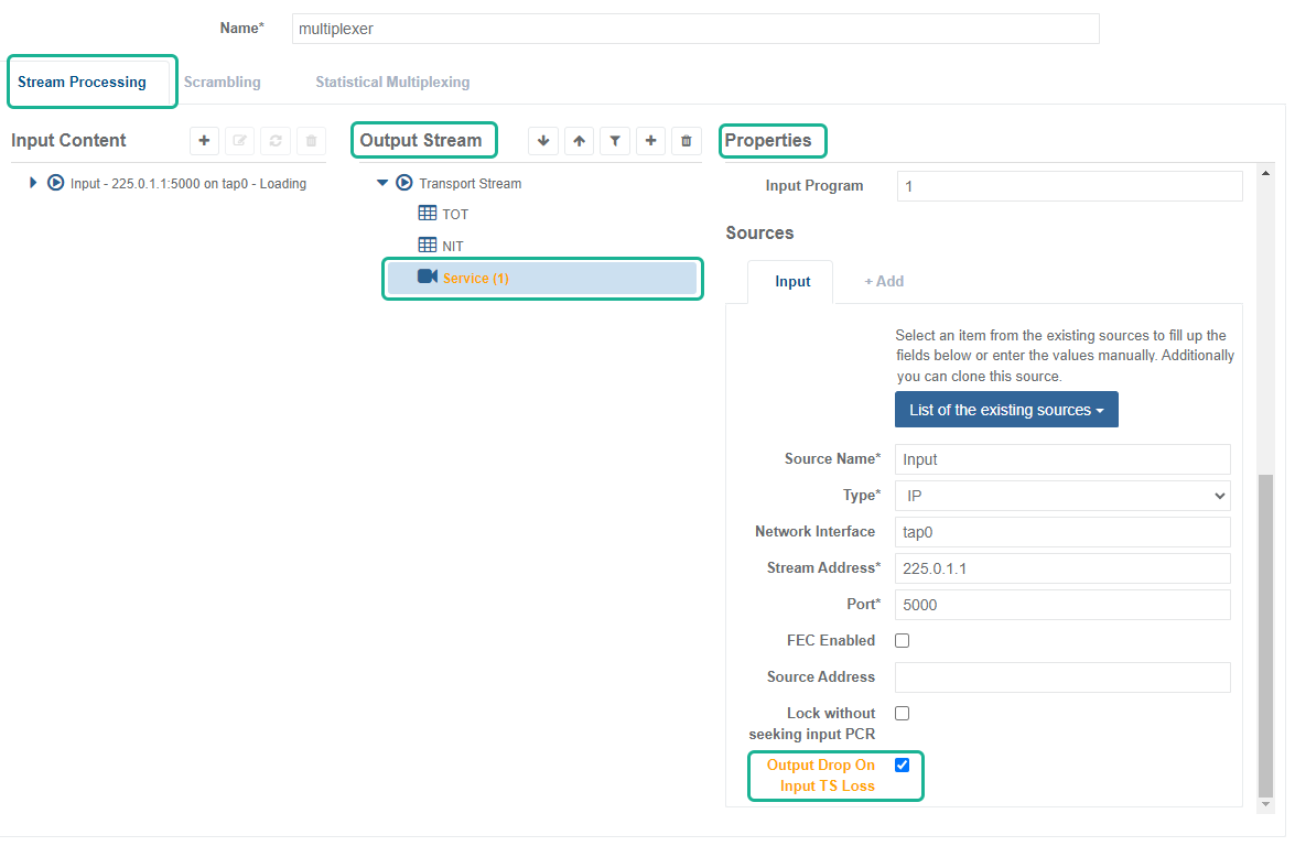 MK.IO Beam can be configured to drop IP/ASI output on input loss. This can be configured for Live Encoder + Multiplexer feed templates.