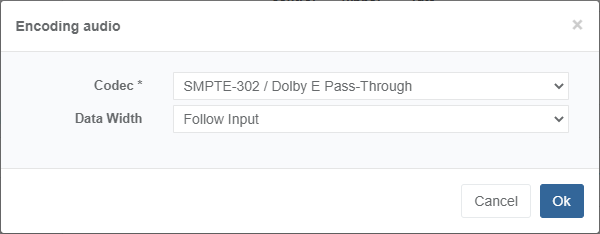 LPCM and Dolby-E inputs on SDI can be passed through and carried on the TS as SMPTE-302 and Dolby-E respectively by selecting the SMPTE-302 / Dolby E Pass-Through codec from Live Encoder Encoding > Audio encoding section (see Configure the audio encoding parameters).