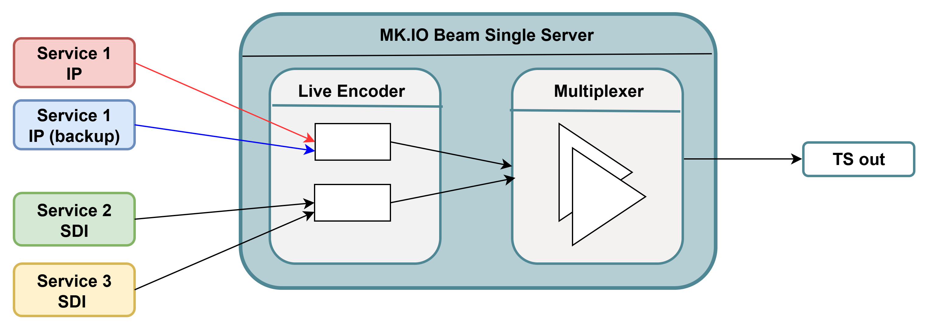 A single server installation of MK.IO Beam can provide limited redundancy through redundant/multiple outputs of a Live Encoding service, offering a pair of sources to a Multiplexer service, which in turn can offer redundant multiple transport stream outputs.