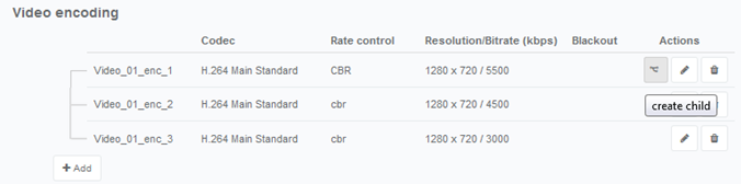 Click in the Actions column to create and configure a child encoding with the corresponding target bit rate.