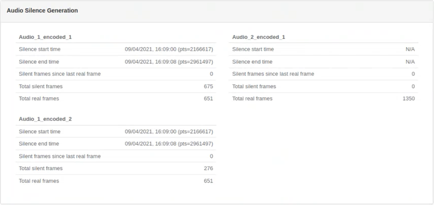 | Insert audio frames on signal loss | Generate audio frames according to the input loss management configured in Media processing tab (silence, 1kHz tone) when the input source is lost. Note: If you activate this option, associated monitoring statistics are available from the Service statistics (see example below). |