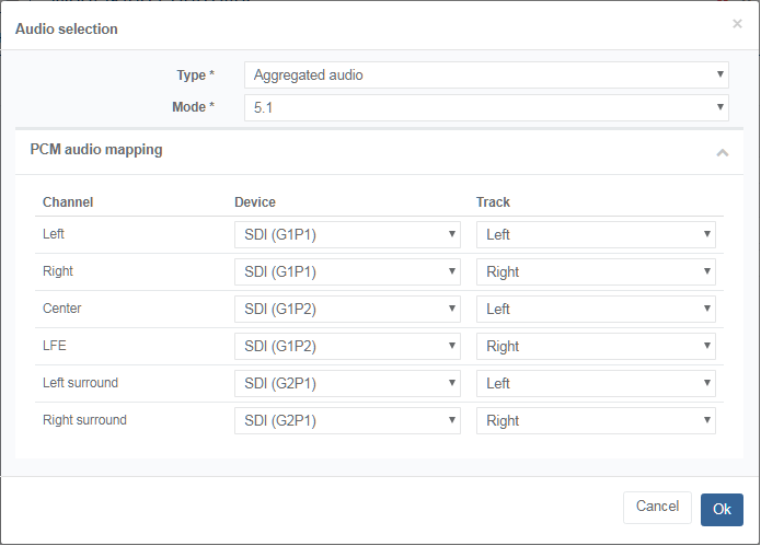 TypeType of audio to create (1) Audio (2) Aggregated audio: Used to extract up to 5.1 audio tracks from the SDI audio pairs