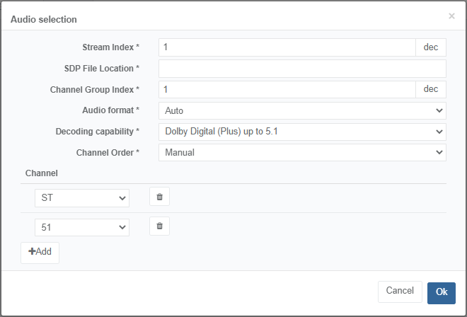Channel OrderSelect if the audio channel groups should be automatically read from the SDP file or manually specified.