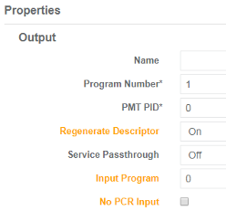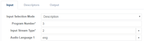 - Descriptor Regeneration: Regenerate descriptors from an incoming TS. Enabling the Regenerate Descriptor setting displays the input TS parameters required to configure the incoming TS and Program number.