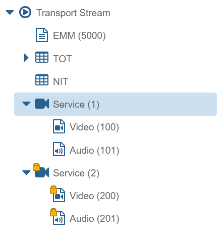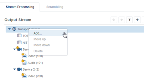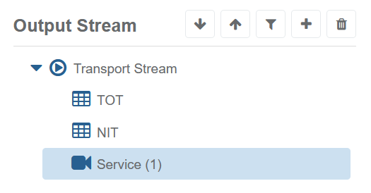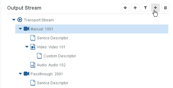 Select the transport stream, or an element in the stream, and use the action buttons to add, delete or organize items.