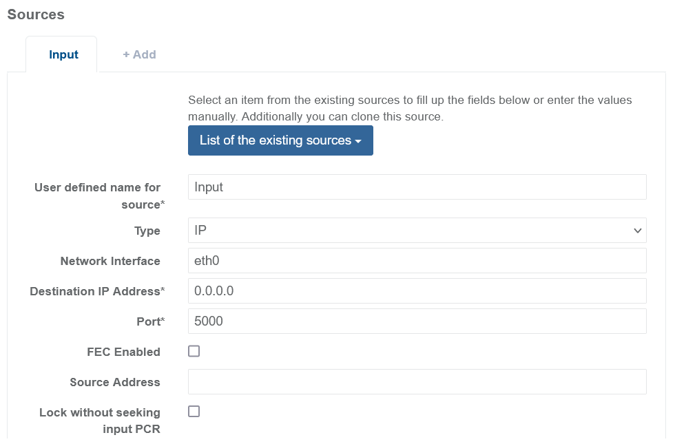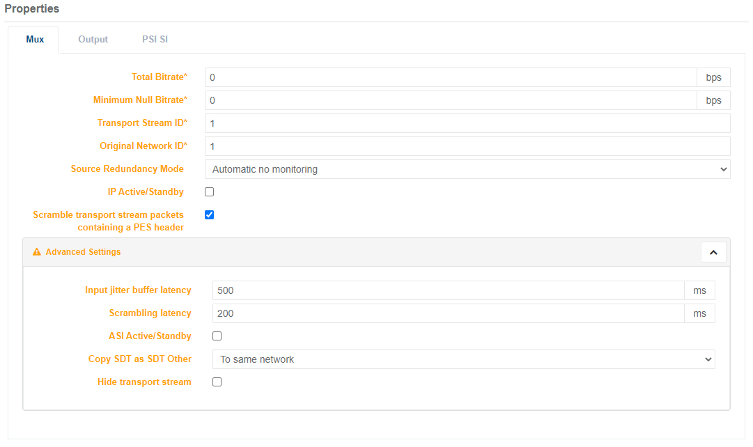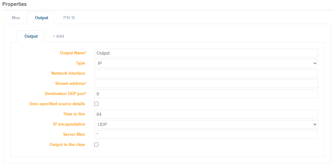 Configure the output multicast details in the Output > Output tab. Multiple outputs for the same Transport Stream can be added using the