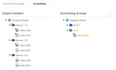 Drag and drop the video component with PID 200 from Service 2 to the Transport Stream in the Scrambling Groups panel. A new SCG is created with PID 200 as the scrambled component.