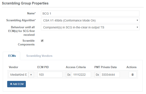 Add an ECM to SCG 1 by selecting the ECMs tab, then click + Add ECM to add and configure. (The Vendor is based on the ECMG definition). The ECM is now configured.