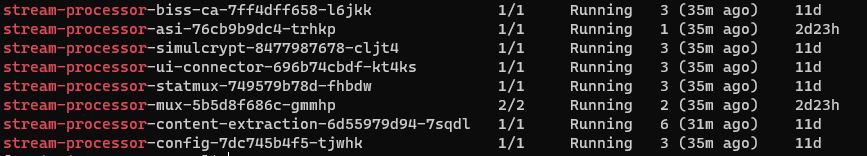 kubectl get pods -n mediakind | grep stream-processor. A list of pods appears with some information associated to each of them: name, ready, status, restarts, age.
