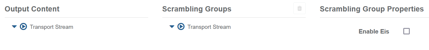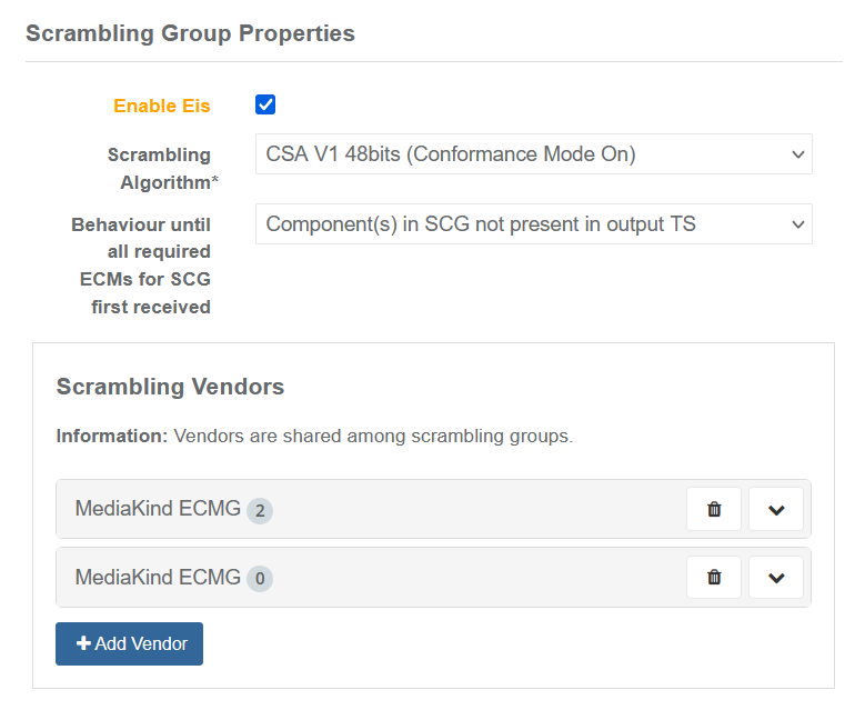 | Behaviour until all required ECMs for SCG first received | Choose how to output until all scrambling information is available. | Dropdown menu: Component(s) in SGC not present in output TS, Component(s) in SCG in-the-clear inn output TS |