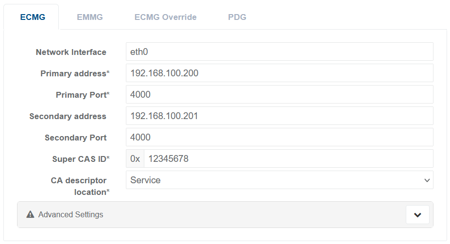 | Primary port* | Port number for the primary ECMG | 0 to 65535 |