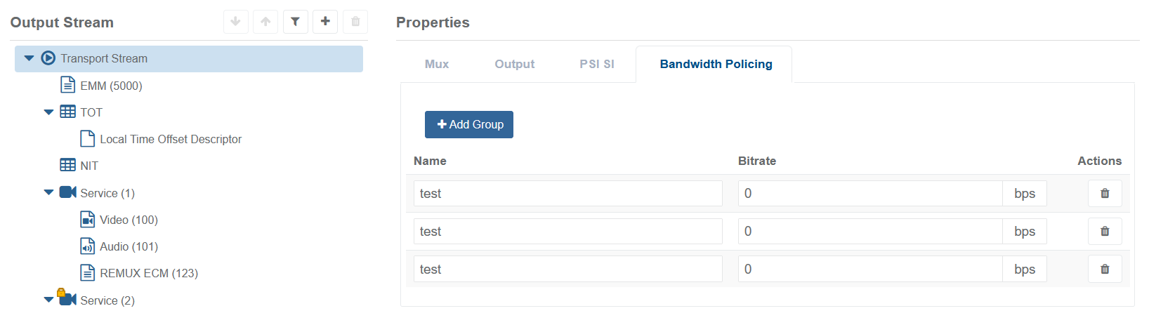 Bandwidth Policing GroupIf any Bandwidth Policing Group has been defined for the transport stream (see previous paragraph), the list of all group names will appear as a dropdown menu. Assign the service to one of the groups or leave the selection empty to avoid policing it.Dropdown menu: names of any defined bandwidth policing group.