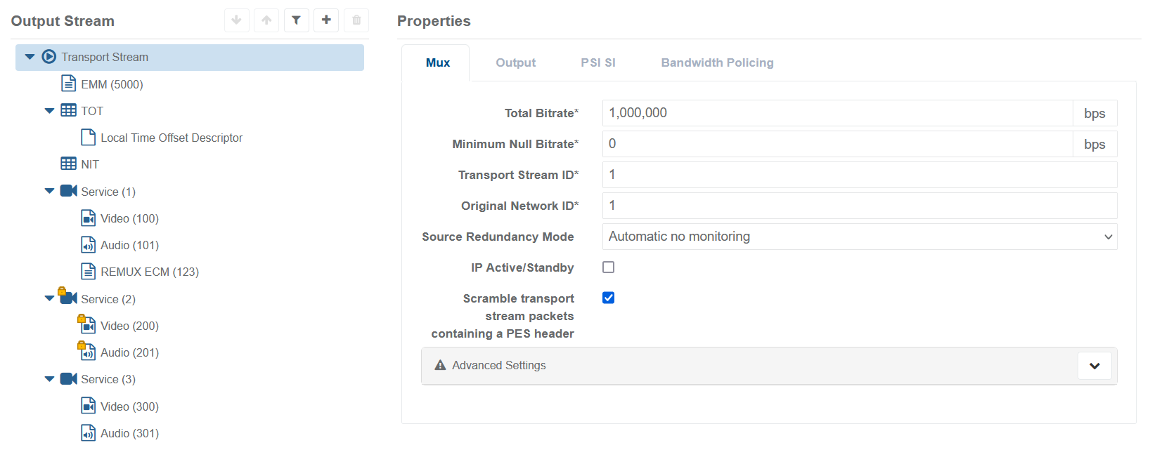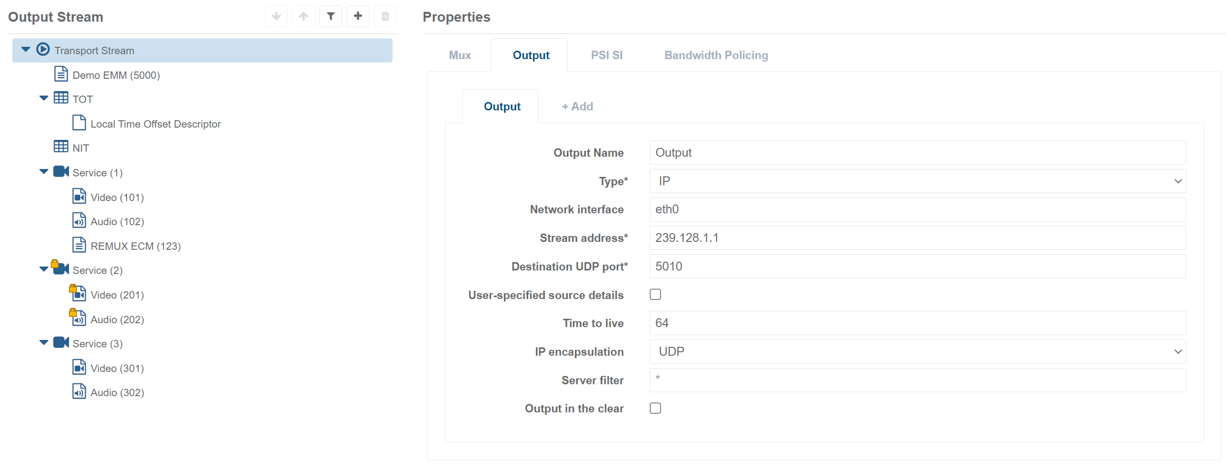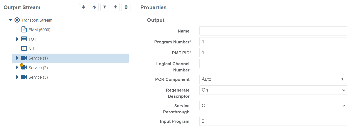 Service PassthroughAutomatically add components and descriptors from the specified input service to this output service. If the specified input service cannot be found, there will not be an output PMT or PAT reference. This behaviour is dynamic and the output PAT/PMT references will track changes to the incoming service.Dropdown menu: Off, On
