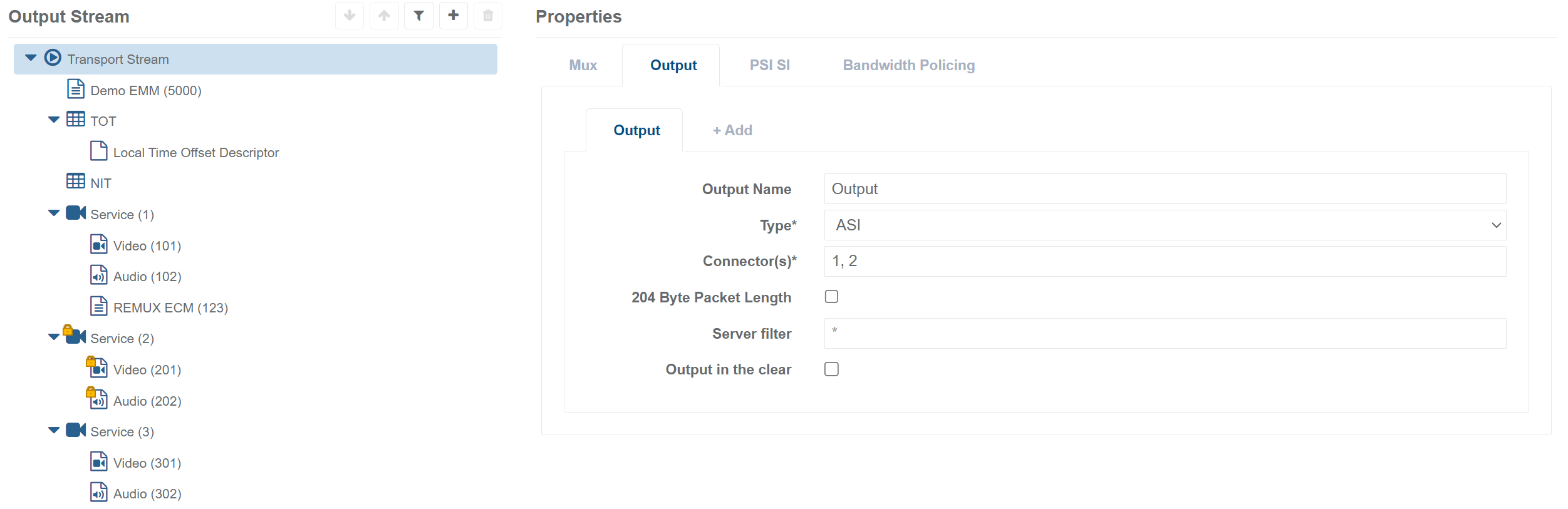 Connector(s)*[ASI only] Specify one or more ASI card connectors to output this Transport Stream on. ASI connector configuration is covered in ASI Card Configuration ToolComma-separated list of integers greater than zero