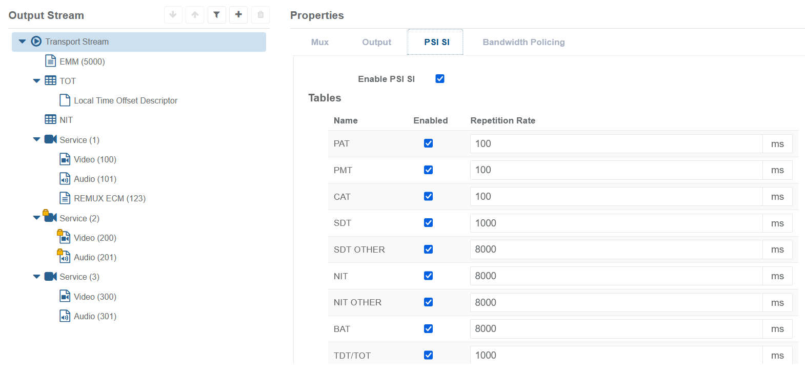 If the Enable or disable PSI SI tick box is enabled (default), it is possible to override the repetition rate (in ms) for any of the listed tables.