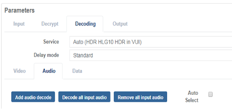Select Audio to display audio decode settings. The first decoded audio is automatically given the reference name Audio 1. This reference is used when configuring the audio outputs.