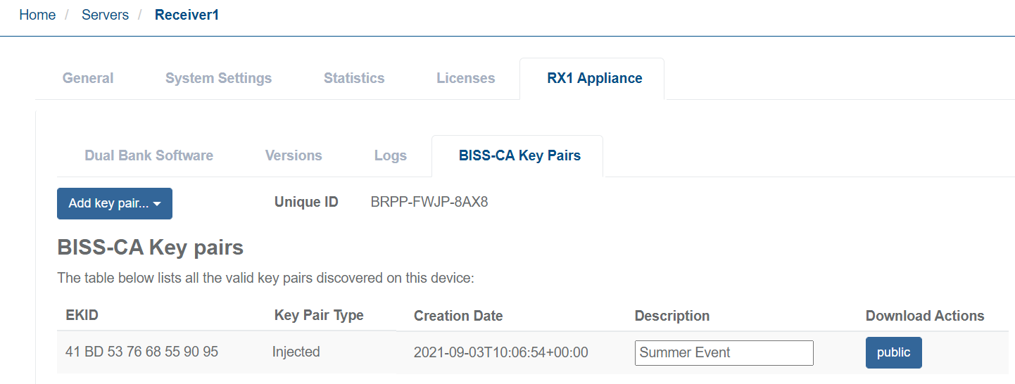 The key pairs that are currently stored on the unit running the receiver can be viewed from the BISS-CA key pairs table under Server Information (see Display BISS-CA key pairs table).