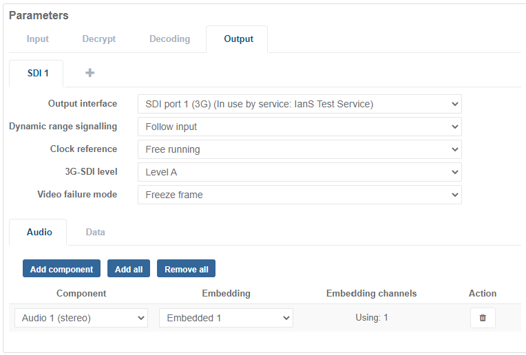 Go to the Audio tab then select Add all. All the decoded audio components that are not currently included in the output audio configuration are added to the component column (up to a maximum number of embedded channels available for the output video format in use). Embedded channels are allocated in sequence until all available channels are filled.