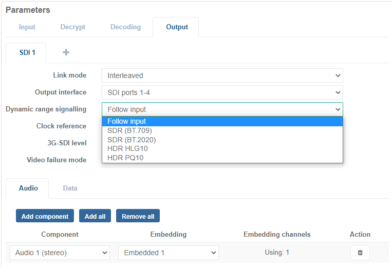 Select a signaling option. The selected SDR/HDR signalling is inserted into the SDI output.