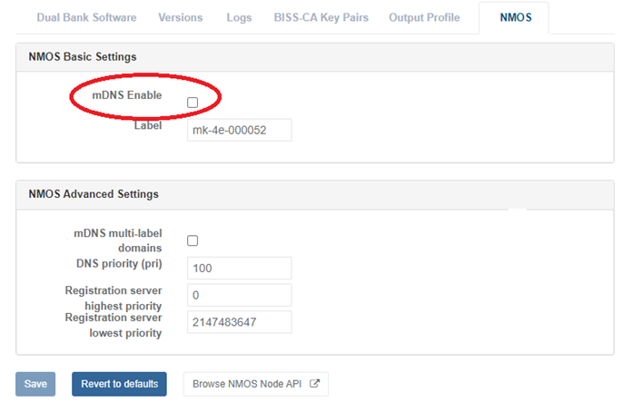 If the device hostname is changed, a reboot is recommended to ensure continued NMOS operation.