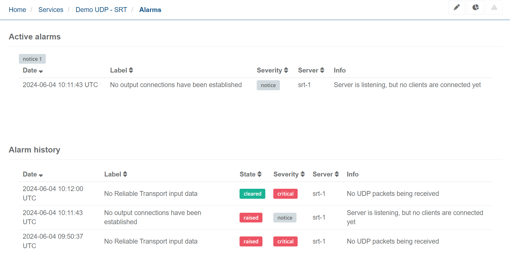 - The page URL above shows this Alarms page applies to service "Demo UDP - SRT"