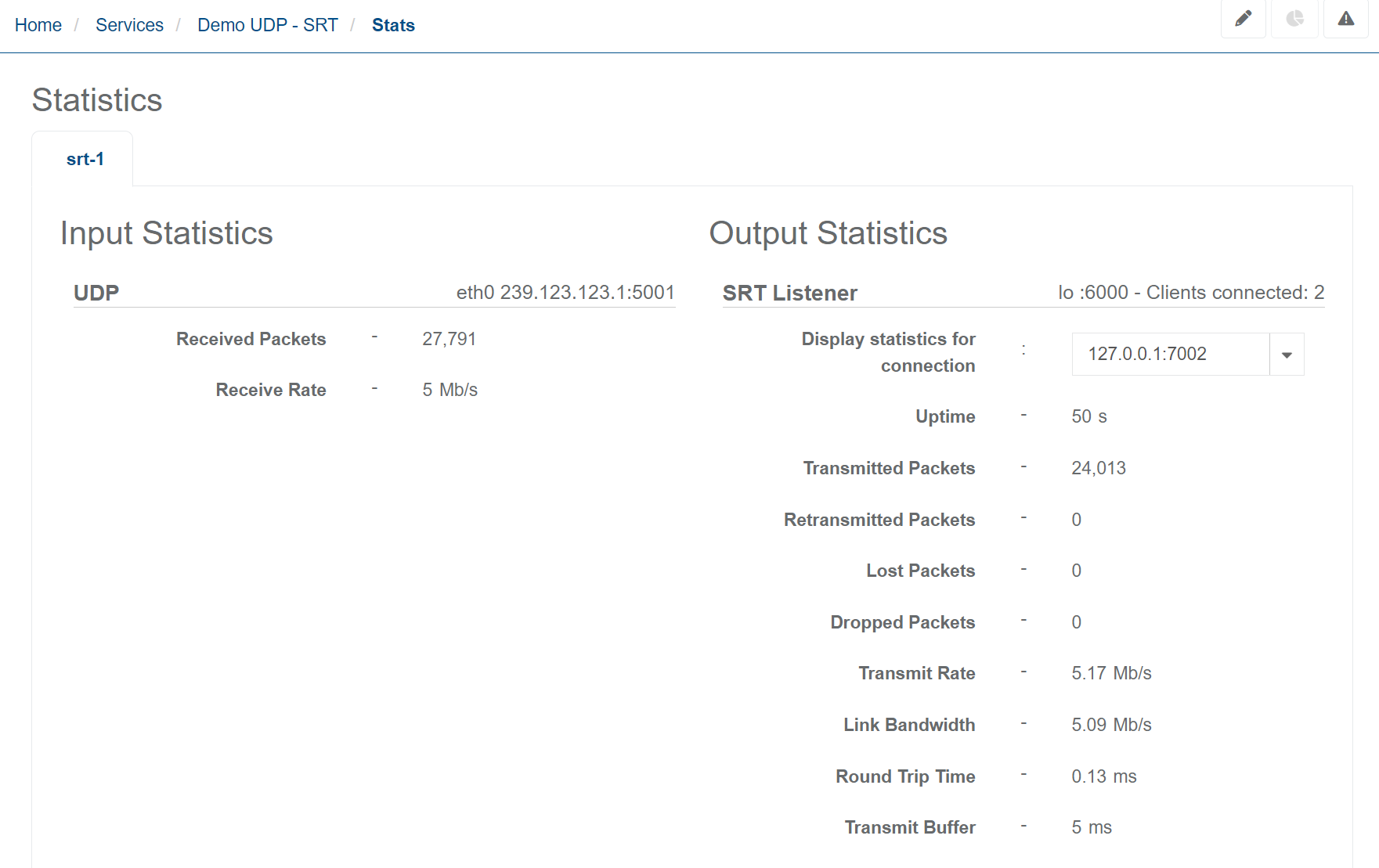 For RIST Listener outputs with multiple connections it is possible to monitor individual statistics for each connection using the dropdown in front of the field Display statistics for connection.