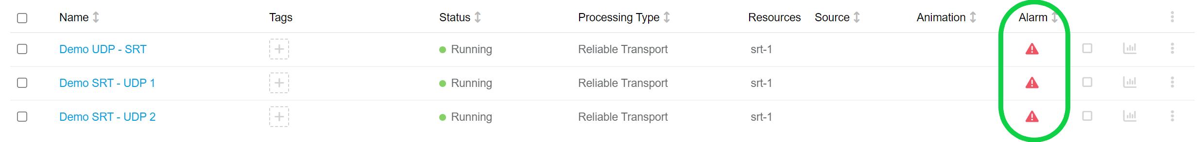 Below is an example for the alarms page of a Reliable Transport configuration using UDP input and SRT Listener output.