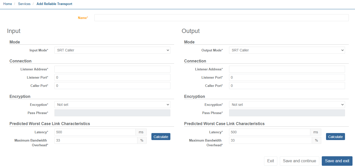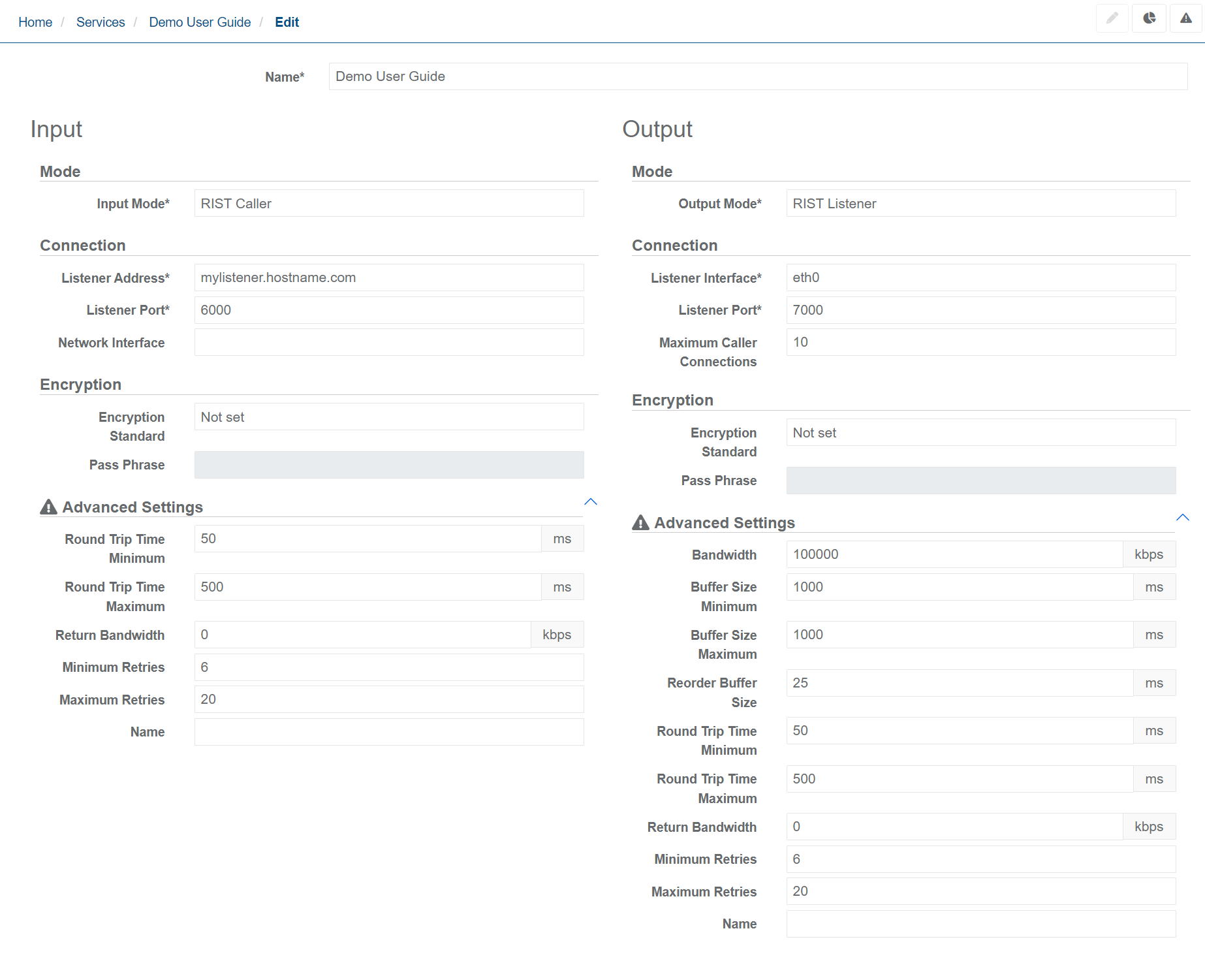 - 1 service with Input Mode = UDP and Output Mode = SRT Listener or Output Mode = RIST Listener