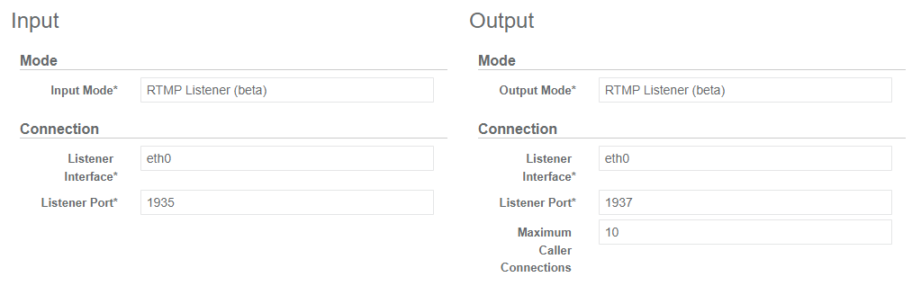 | Maximum connections | Maximum allowed number of RTMP Callers that can connect to the output RTMP Listener. | Integer number between 1 and 65535 |