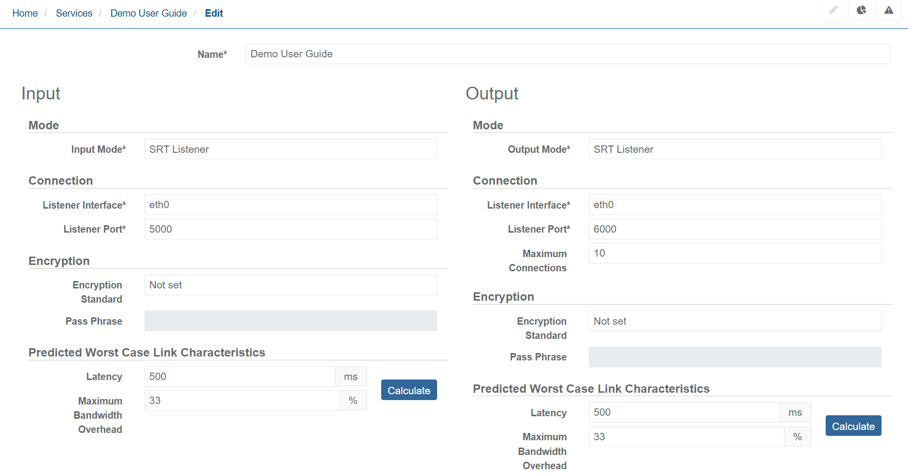 Set Round Trip Time and Packet Loss Rate according to the instructions and make sure the calculated values for SRT latency and Maximum Bandwidth Overhead do not show errors.