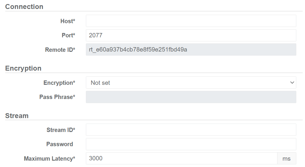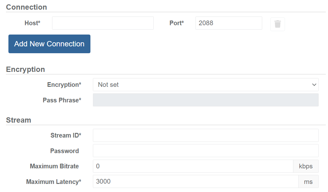 | Listener Address* | IP Address or hostname of the SRT Listener to connect to. | IPv4 address (without leading zeros) or hostname. |