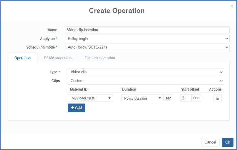 Parameter Description Clip Set to Custom to manually configure the video clip or set to Auto (following SCTE-224) to use material from SCTE-224 viewing policy. Duration Can be manually configured, or automatically configured with Policy duration when selecting trigger point with value at the beginning Material ID ID of the Flash SWF object on Encoding Live. Start offset Offset in seconds the video clip will start playing at.