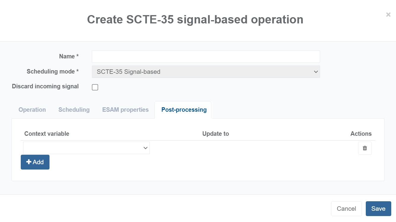 - The Stream Conditioning scheduling & control timeline page (Resident SCTE-35 signal-based operations > + Add > Post-processing).