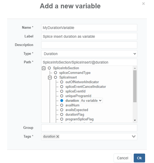 Prisma comes with a pre-configured set of variables that you can use to manage SCTE-35/SCTE-224 filtering, creation and rewriting.