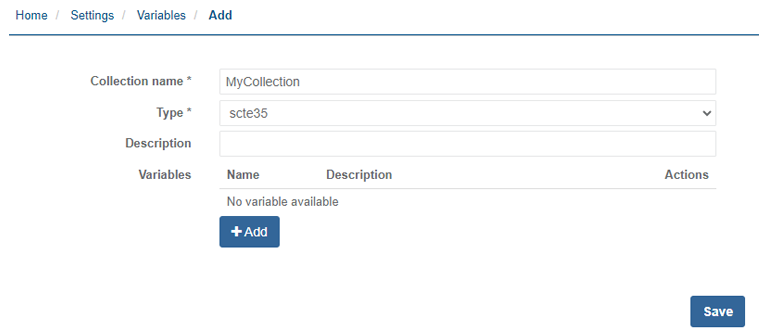Parameter Description Collection name Define the collection name, must be unique Type The type of the collection which will be used to the variables. Select one of the three available values: scte35, scte224 and context. Description Provide information about the collection.
