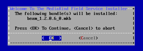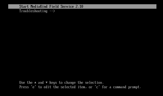 When first booting to the MK.IO Beam ISO, you will see a screen which shows two options, Start MediaKind Field Service 2.x and Troubleshooting. Select Start MediaKind Field Service 2.x and press the Return key.