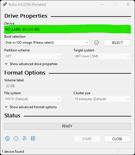- Run Rufus and connect the target USB drive to the Windows PC