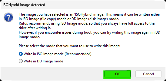- When prompted about ISOHybrid image, leave the default ISO Image mode set and click OK: