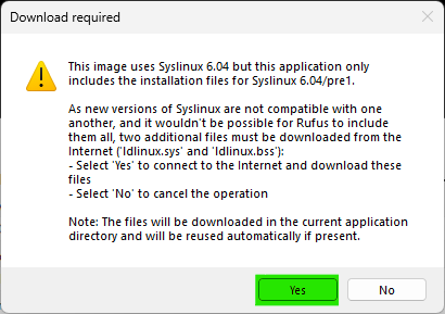 - If prompted to download the Syslinux installation files, click Yes: