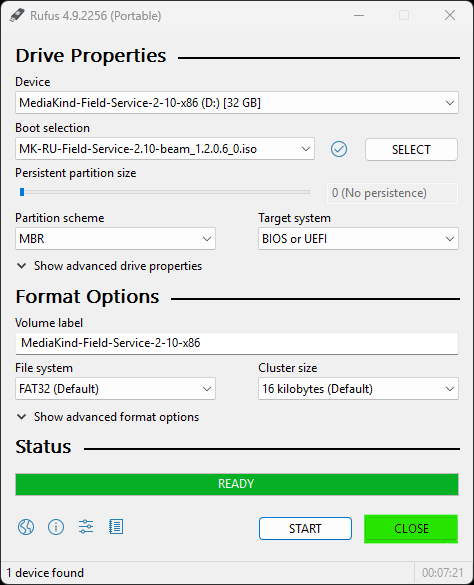 - When the ISO file has been written to the USB drive, Rufus will change the status to READY: